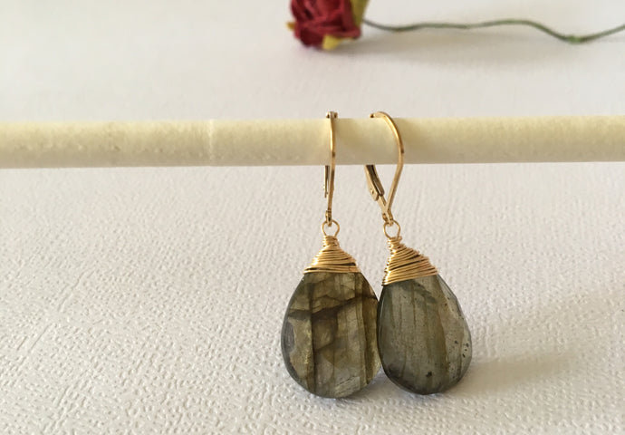 Petite Romantic Teardrop Earrings with Green Mystic Quartz, Grey Pearl and Labradorite