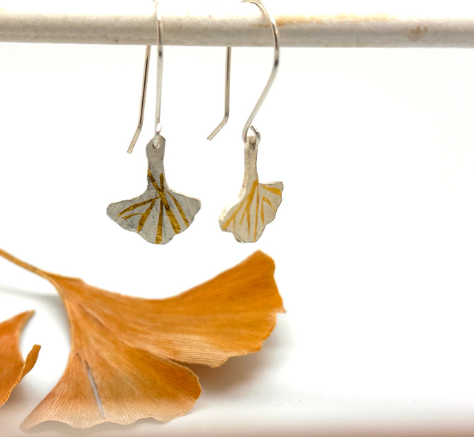 • Gold and Silver Keum Boo Small Ginkgo Leaf Drop Earrings