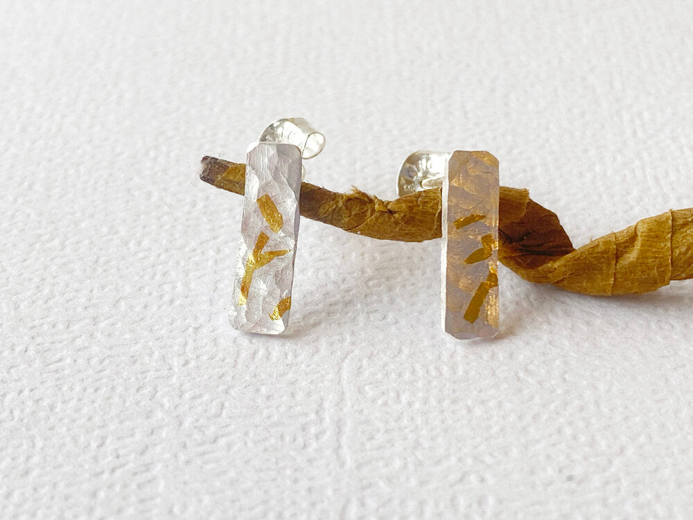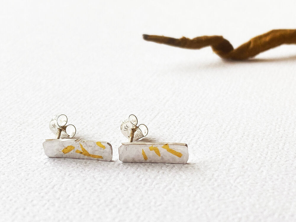 Used Keum Boo Technique to make these small dainty and cute stud earrings. 24 karat pure gold leaf is fused by using high heat and pressure onto fine silver sheet that I saw into little hammered rectangle shapes. These studs will be your to go earrings.