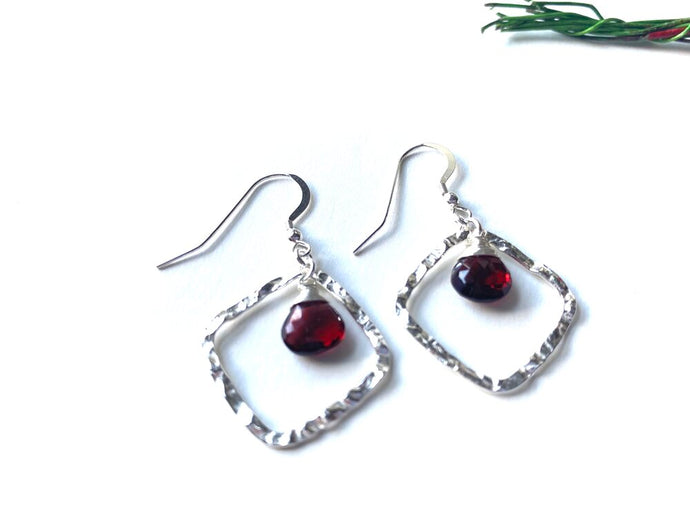 Hammered Diamond Sterling Silver Earrings with Garnet