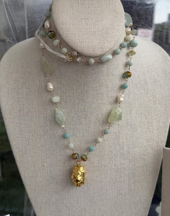 Green mystic quartz Necklace with focal pearl & Clusters of Pearls