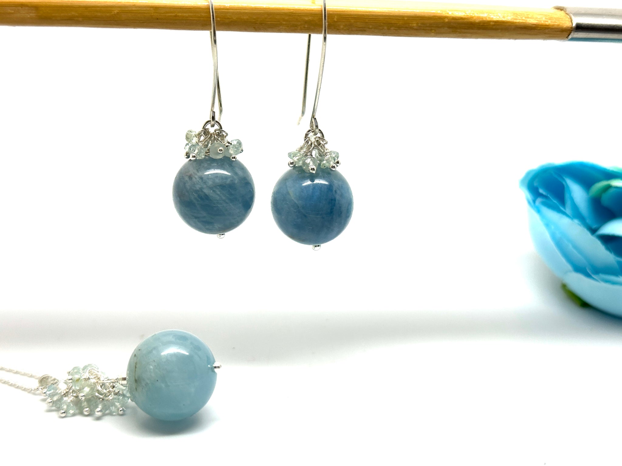 These aesthetic and feminine aquamarine earrings might the perfect choice for March Birthday body of yours.  They are made with 12mm smooth high quality aquamarine bead and multiple faceted aquamarine roundels. Used sterling silver wires to finish these earrings.