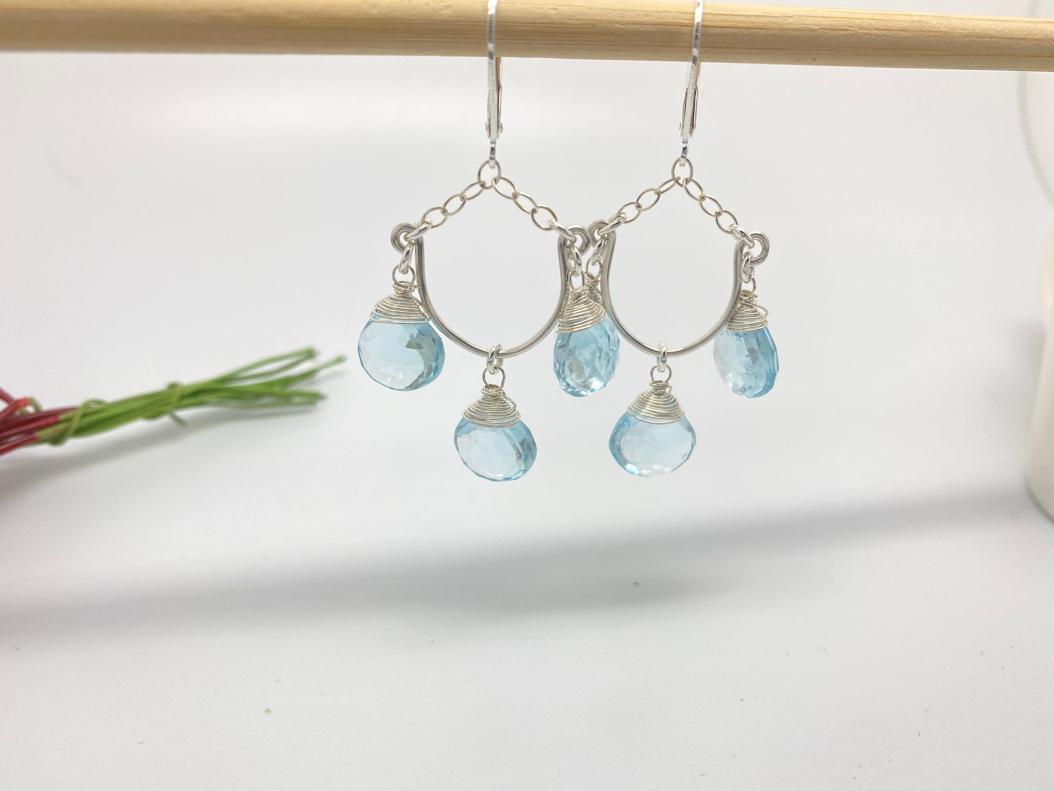 Sparkling faceted blue topaz briolettes wire wrapped with Sterling Silver or 14kt Gold Filled wire, suspended inside a matching metal handmade and formed horse shoe shape chandelier frame.