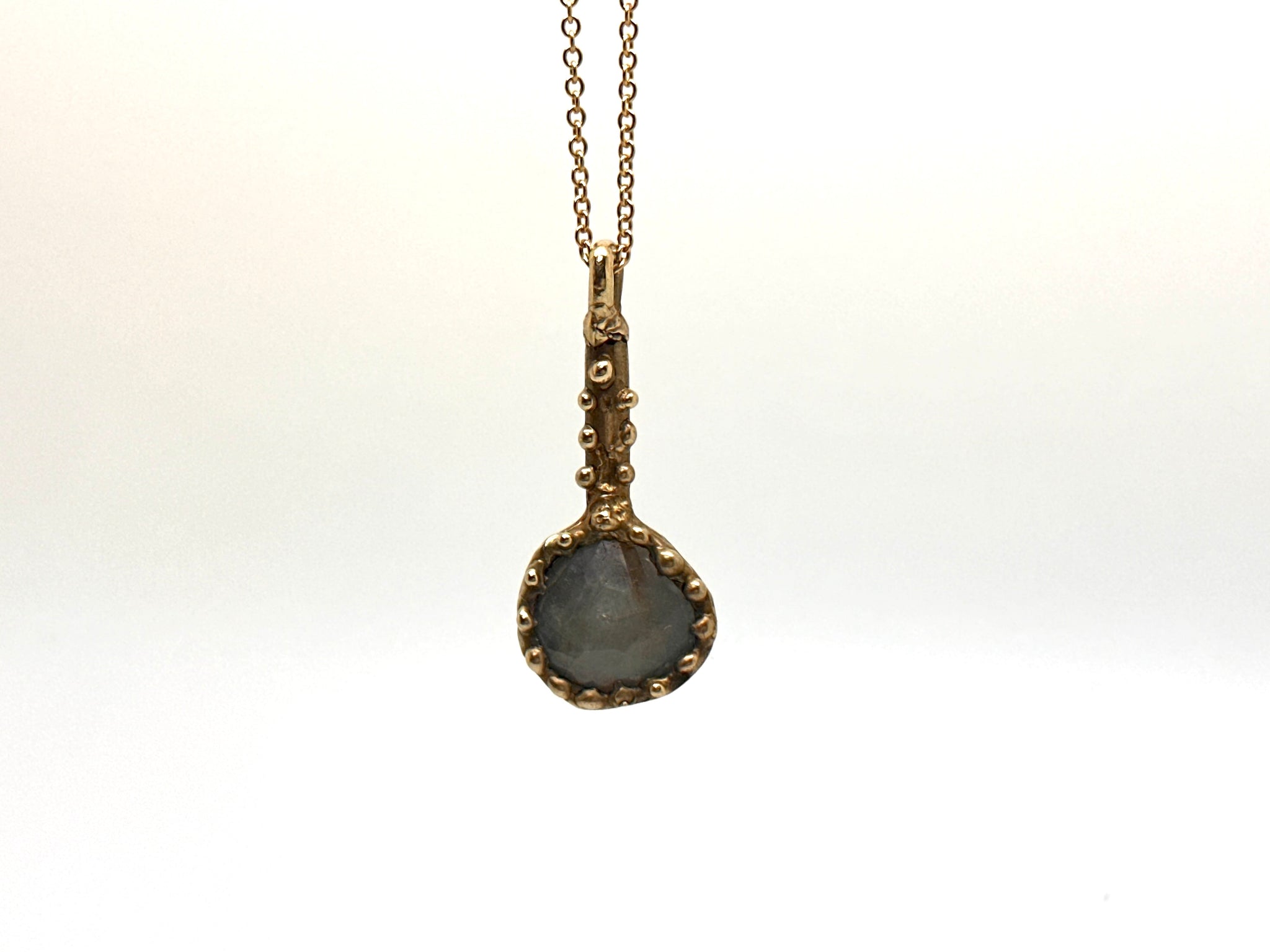 Adorn yourself with the mesmerizing allure of an emerald in a meticulously crafted brass setting, capturing the essence of nature's abstract beauty. This necklace elegantly merges the richness of the emerald with the rustic charm of brass, creating a wearable masterpiece inspired by the enchanting intricacies of the natural world.