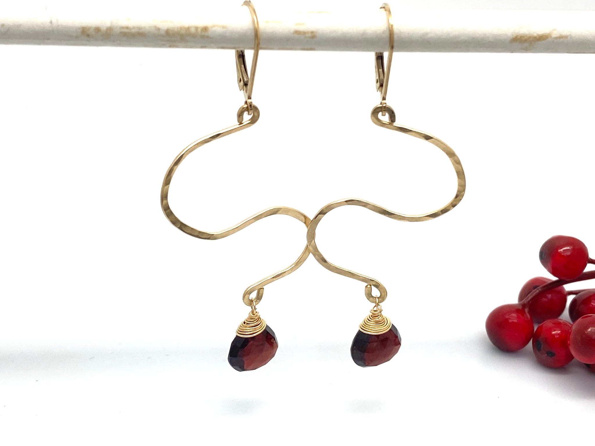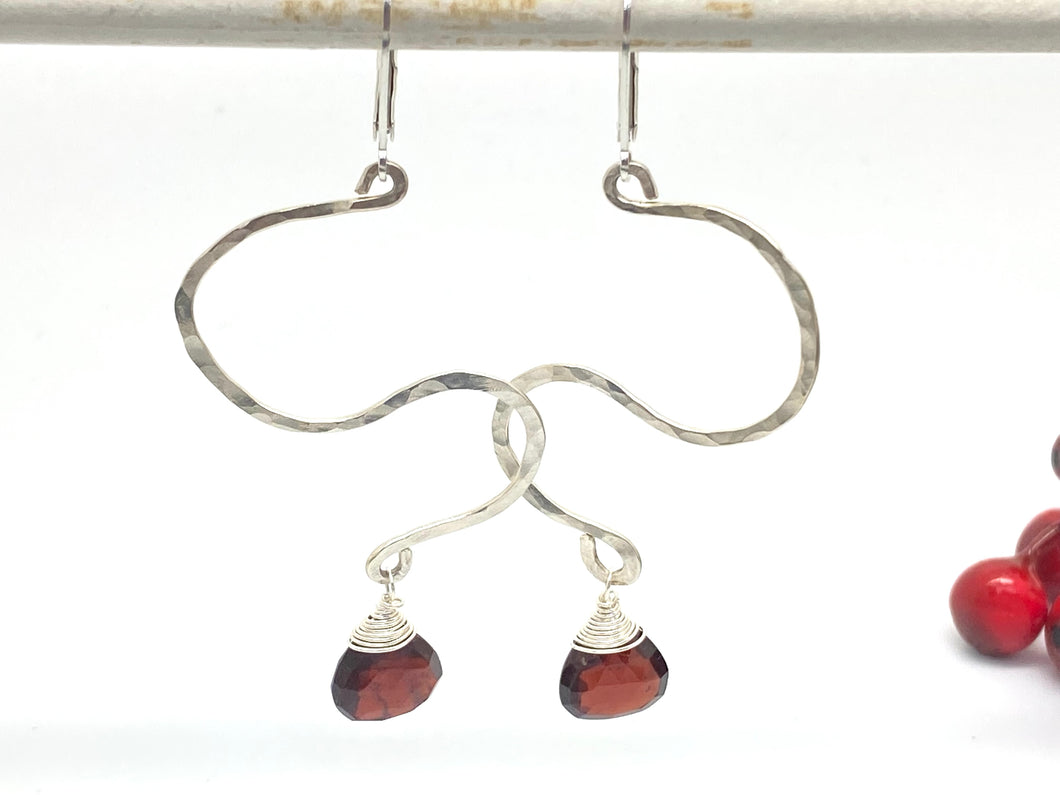 Faceted garnet on hand forged and hand hammered 14kt gold filled or sterling silver zigzag shape wires, all on matching metal lever back earring wires.