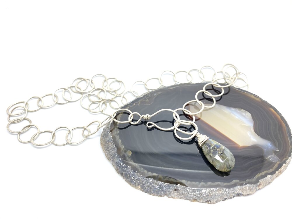 Used argentium silver to create these hammered links. Also used wire wrapping technique to attach the 20x14mm faceted teardrop labradorite to this beautiful necklace. The closure is handmade by using sterling silver wires.