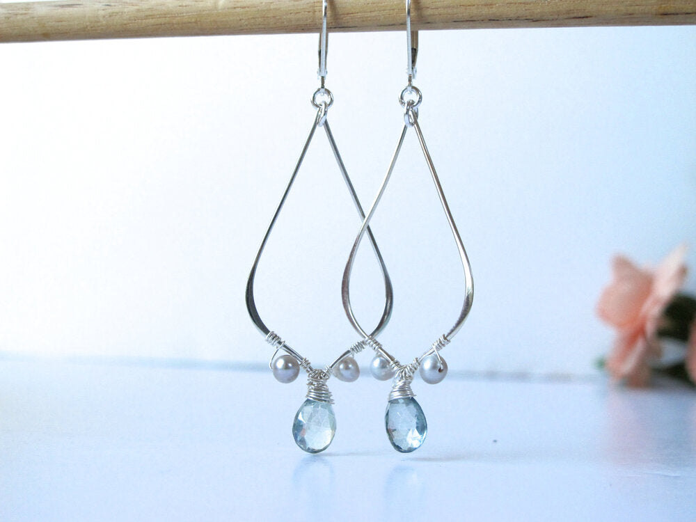 Faceted Green Mystic Quartz teardrops and grey pearls hand wrapped on sterling silver romantic long teardrop , all on sterling silver leverback earring wires.