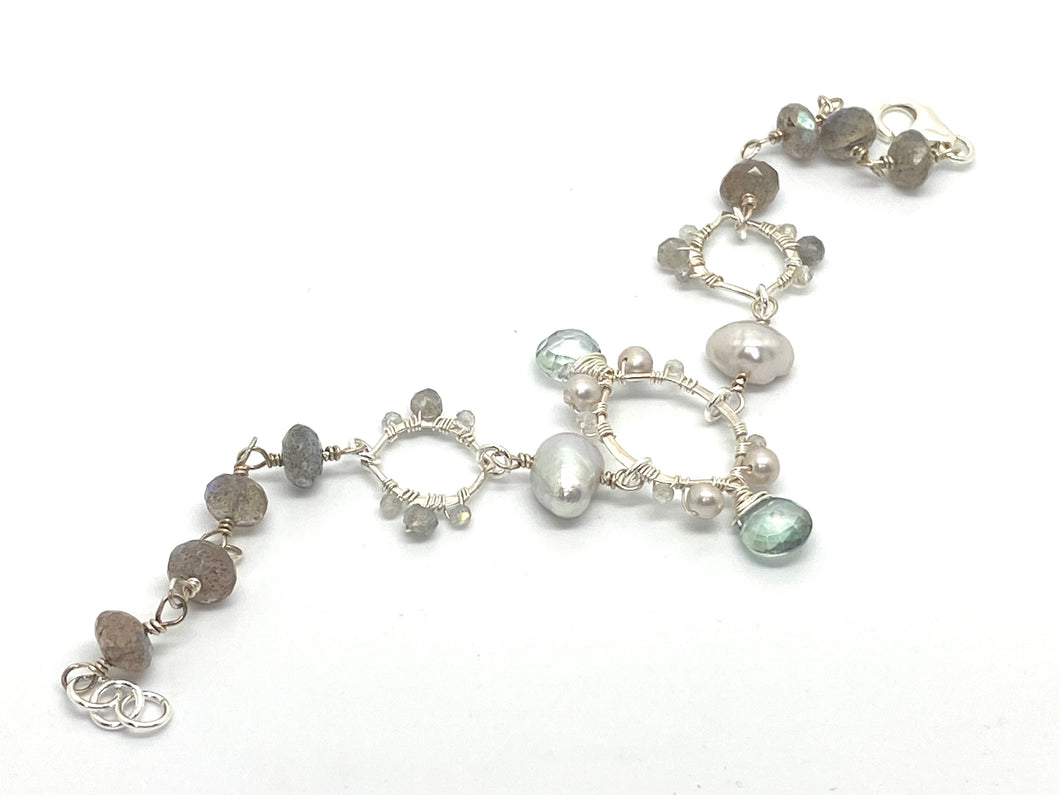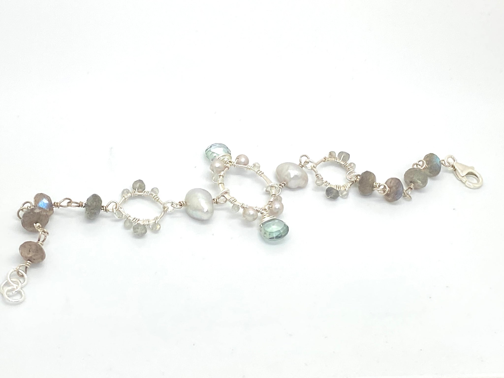 Faceted Green Mystic Quartz teardrops, faceted small and medium size labradorite beads and grey pearls are wire wrapped on sterling silver teardrops to form this romantic bracelet. It is finished with good size lobster claw for easy closure. The metal is sterling silver.