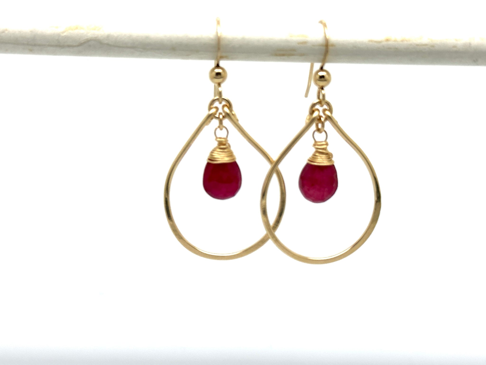 These ruby dangle earrings are made from 14kt gold filled handmade teardrop frames that are inspired by victorian era fashion. They measure 3/4" wide and 1 1/2" long.