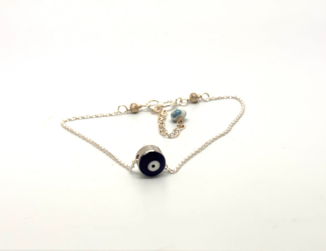 Silver plated 7mm evil eye charm is slipped through to sterling silver cable chain to make this simple and elegant evil eye bracelet. Pyrite gemstone beads are wire wrapped to the spring ring.