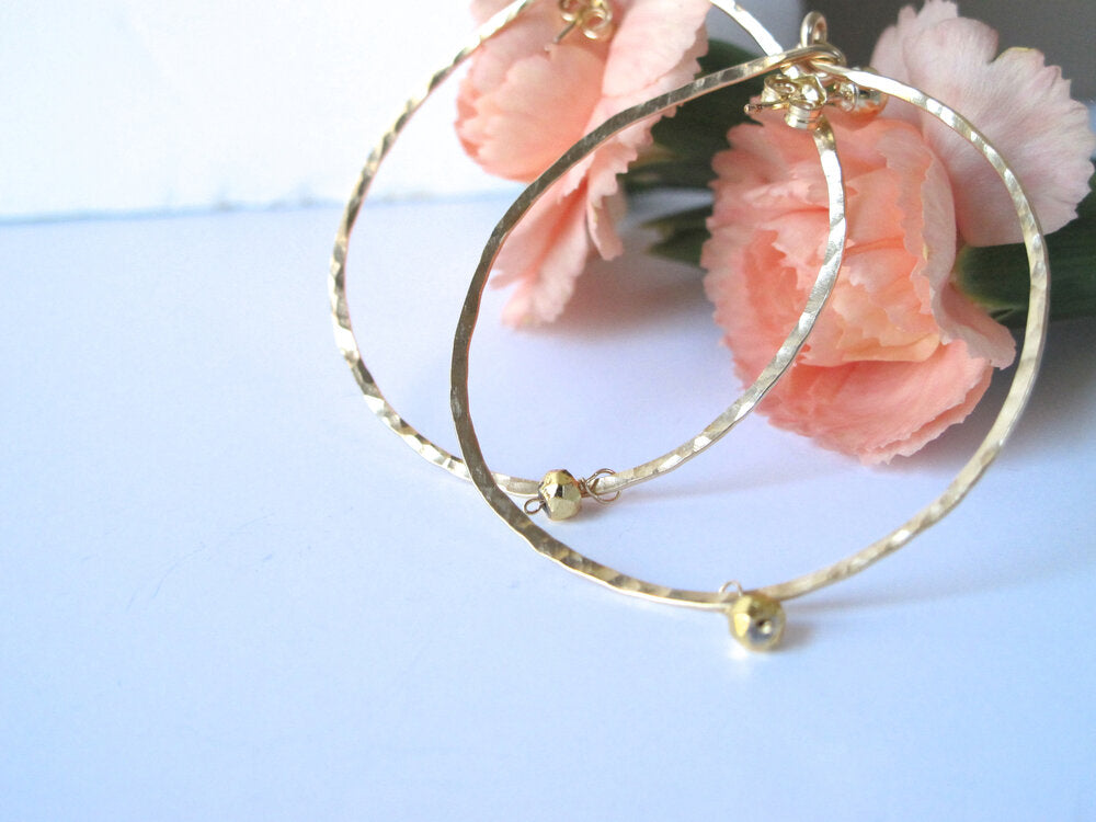 Hand hammered and hand forged 14 karat gold filled hoop drop earrings for your everyday use. It is a medium size and light weight earrings with small faceted pyrite bead.