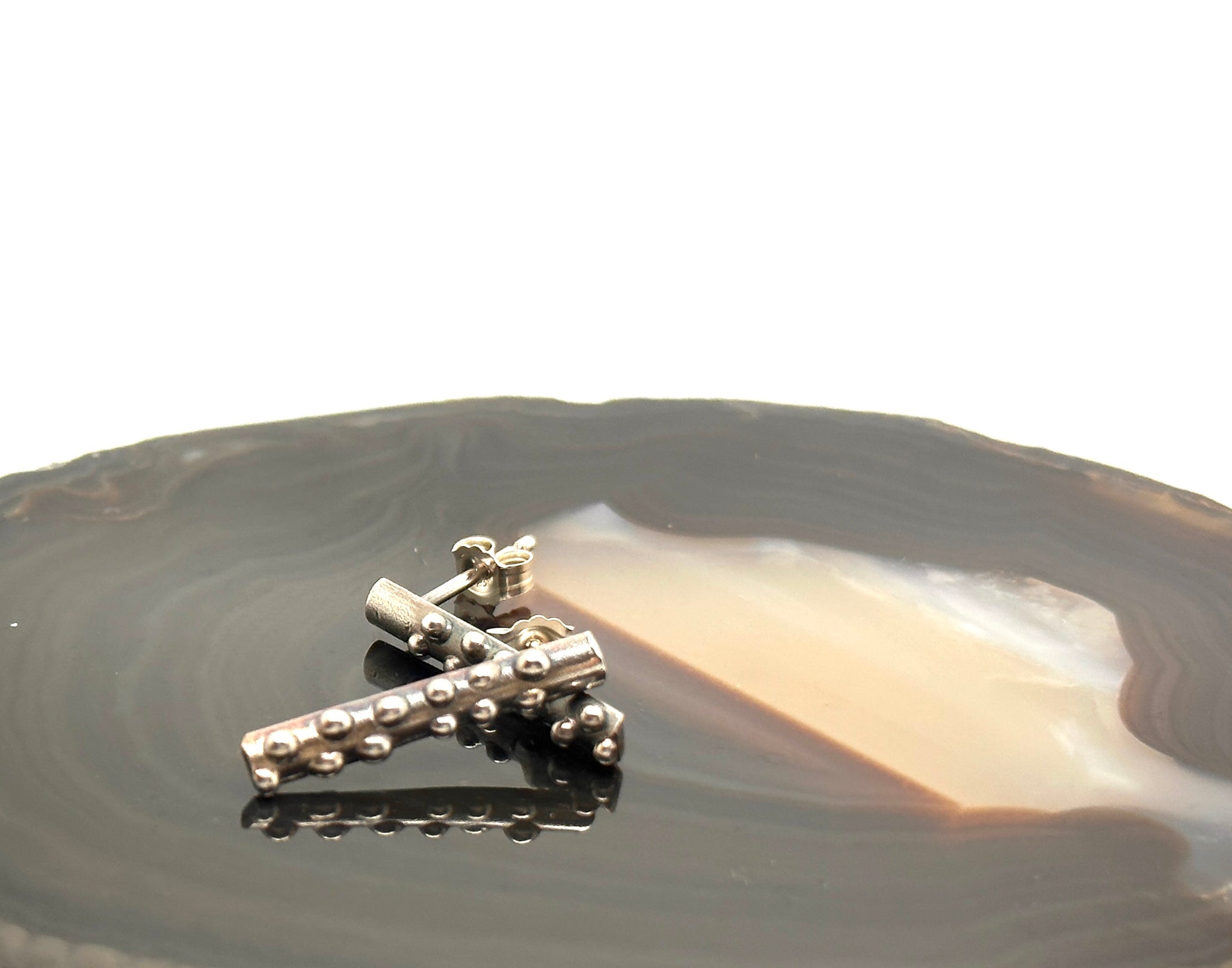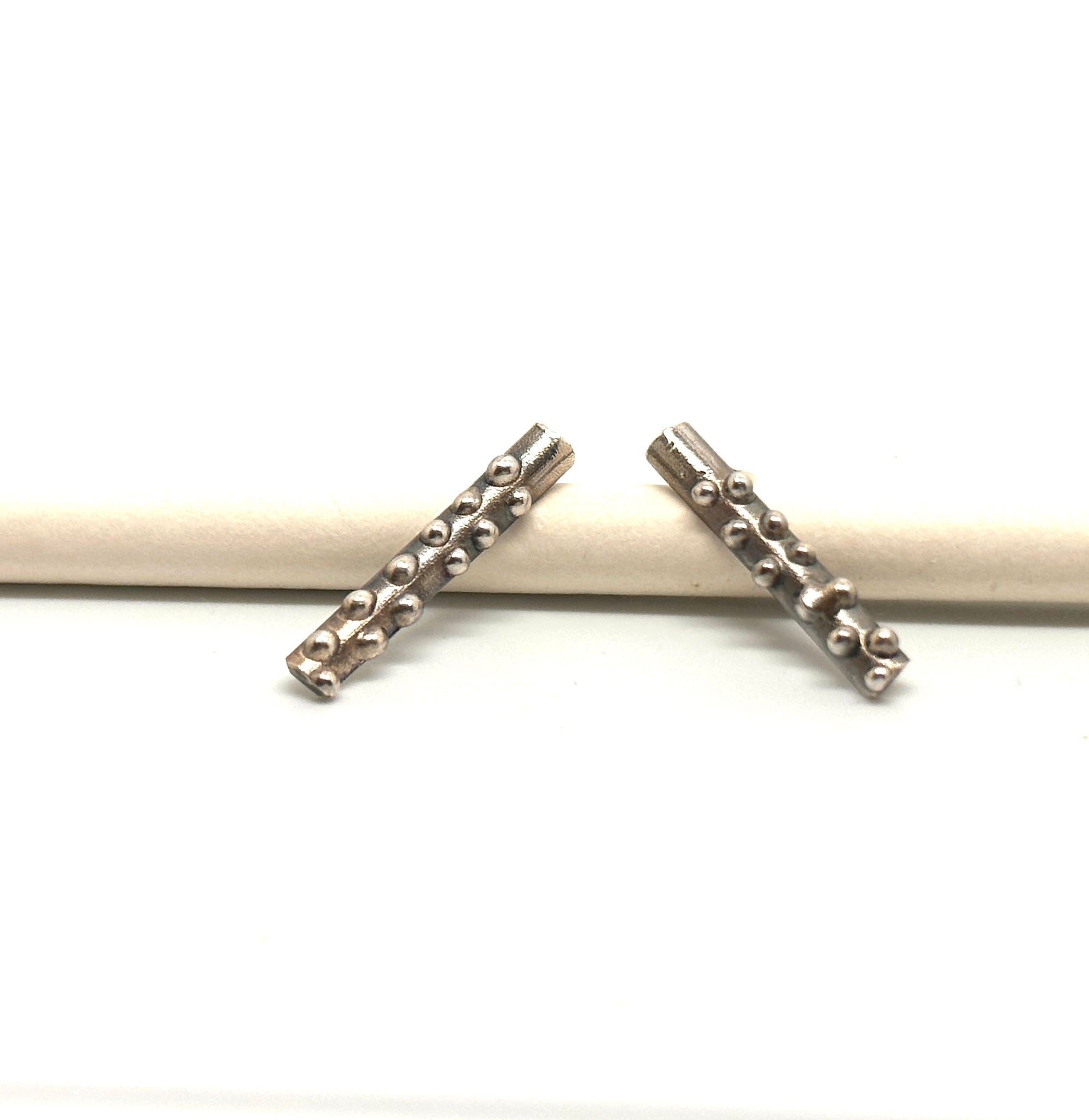Elevate your accessory collection with these handmade dotted bar post earrings, expertly crafted using the ancient lost-wax casting technique. Each earring features a slim linear bar design adorned with raised dot detailing, capturing the essence of vintage metalwork and old-world craftsmanship.