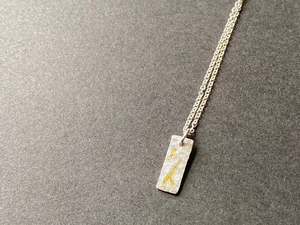 Used Keum Boo Technique to make this statement petite rectangle necklace. 24 karat pure gold leaf is fused by using high heat and pressure onto fine silver sheet that I saw into hammered petite rectangle shape. And the chain is Sterling Silver Cable chain.