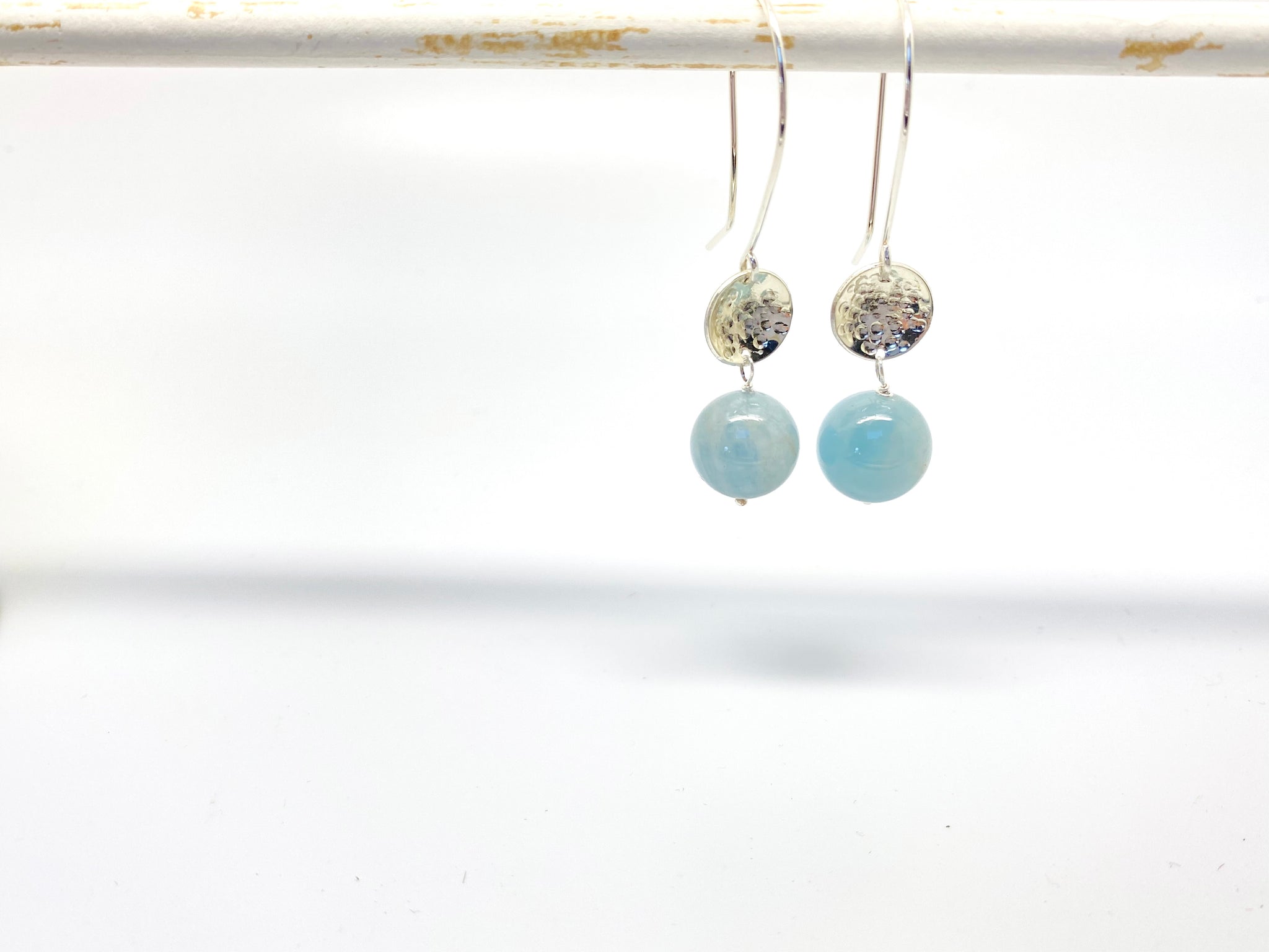 Used 10mm sterling silver disks to make these pretty earrings. Convex shapes are made by hand hammering. Also smooth beautiful 12mm aquamarine beads are wire wrapped to the hammered disks.