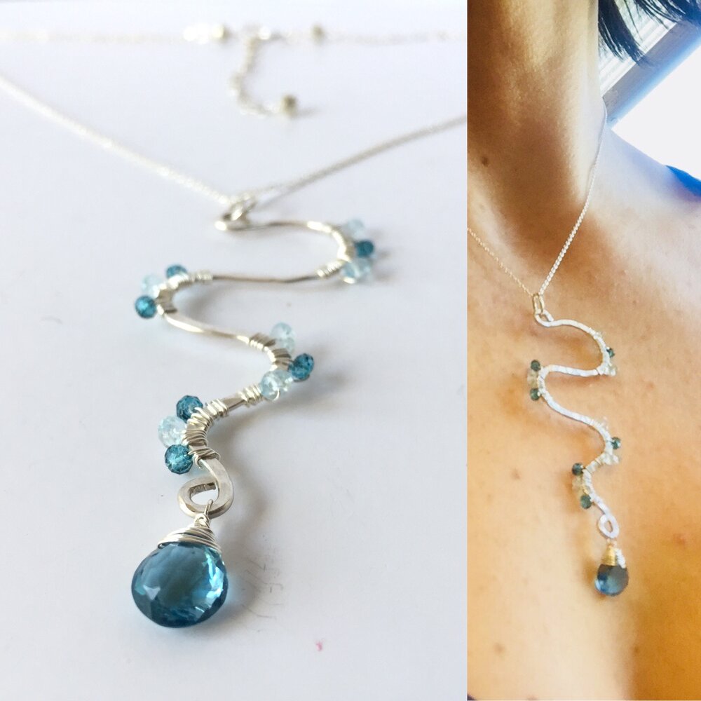 This one of a kind necklace will be one of the accessories that you cannot miss in your outings . Used Faceted London Blue Quartz Briolettes, blue topaz and blue zircon wire wrapped in sterling silver metal...