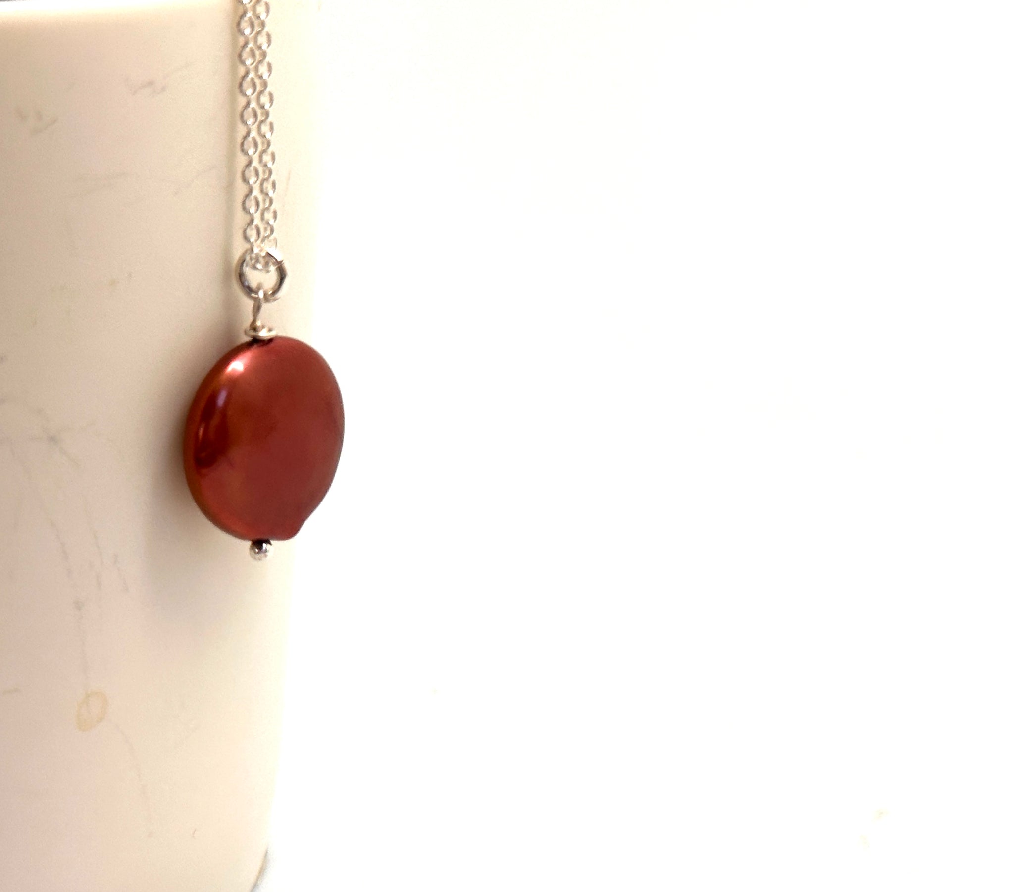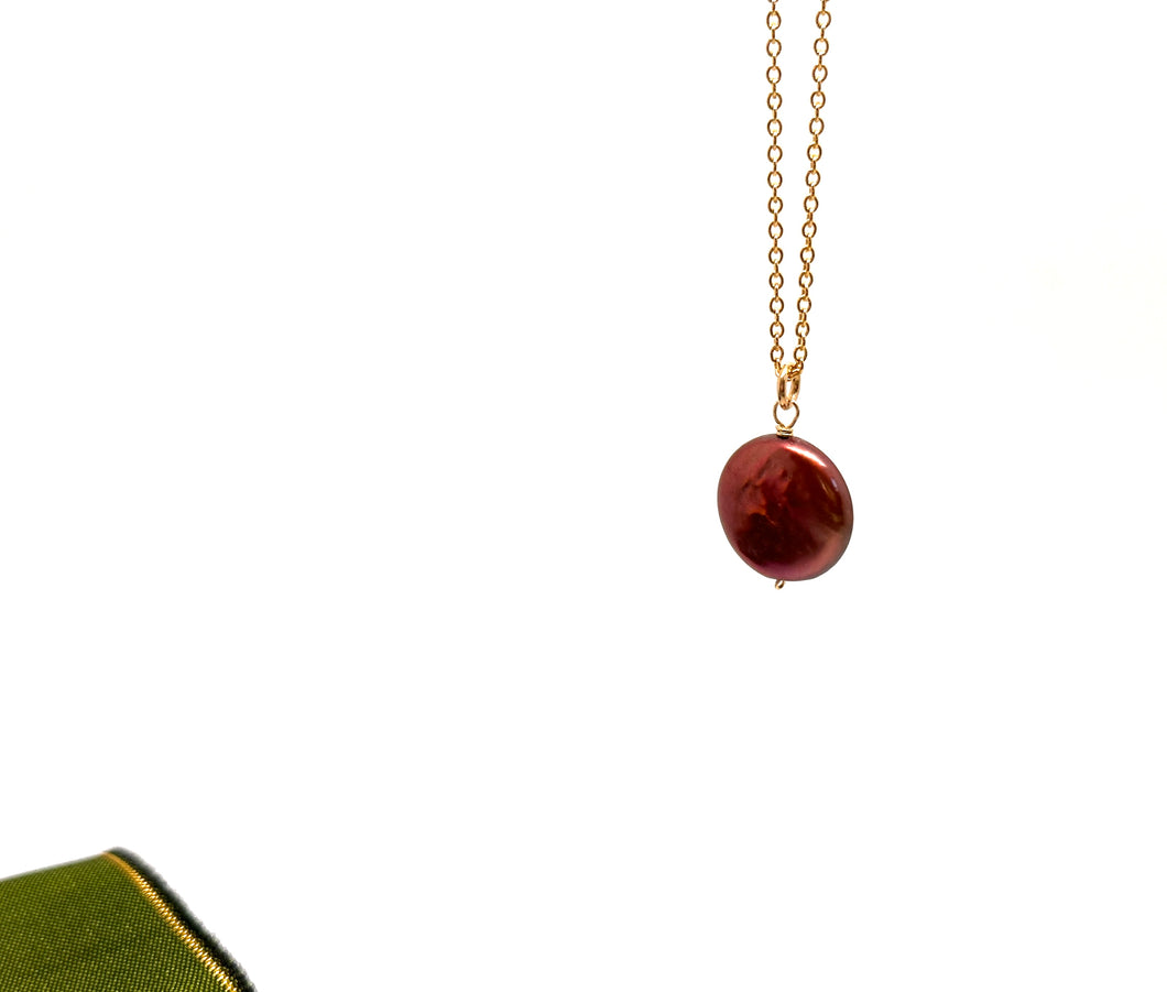 This pretty and feminine red coin pearl is wire wrapped in precious metals and finished with fine cable chain.