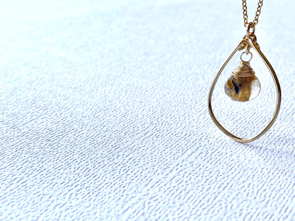 This romantic rutilated quartz necklace is made from 14kt gold filled handmade teardrop frames that are inspired by victorian era fashion.